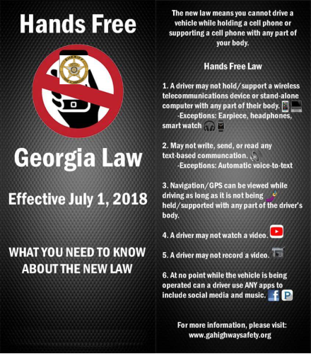Police Douglasville GA Patch A driver cannot have a phone in their hand or use any part of their body to support their phone. All of the answers. Like all laws there are consequences for violating Georgias hands free laws.